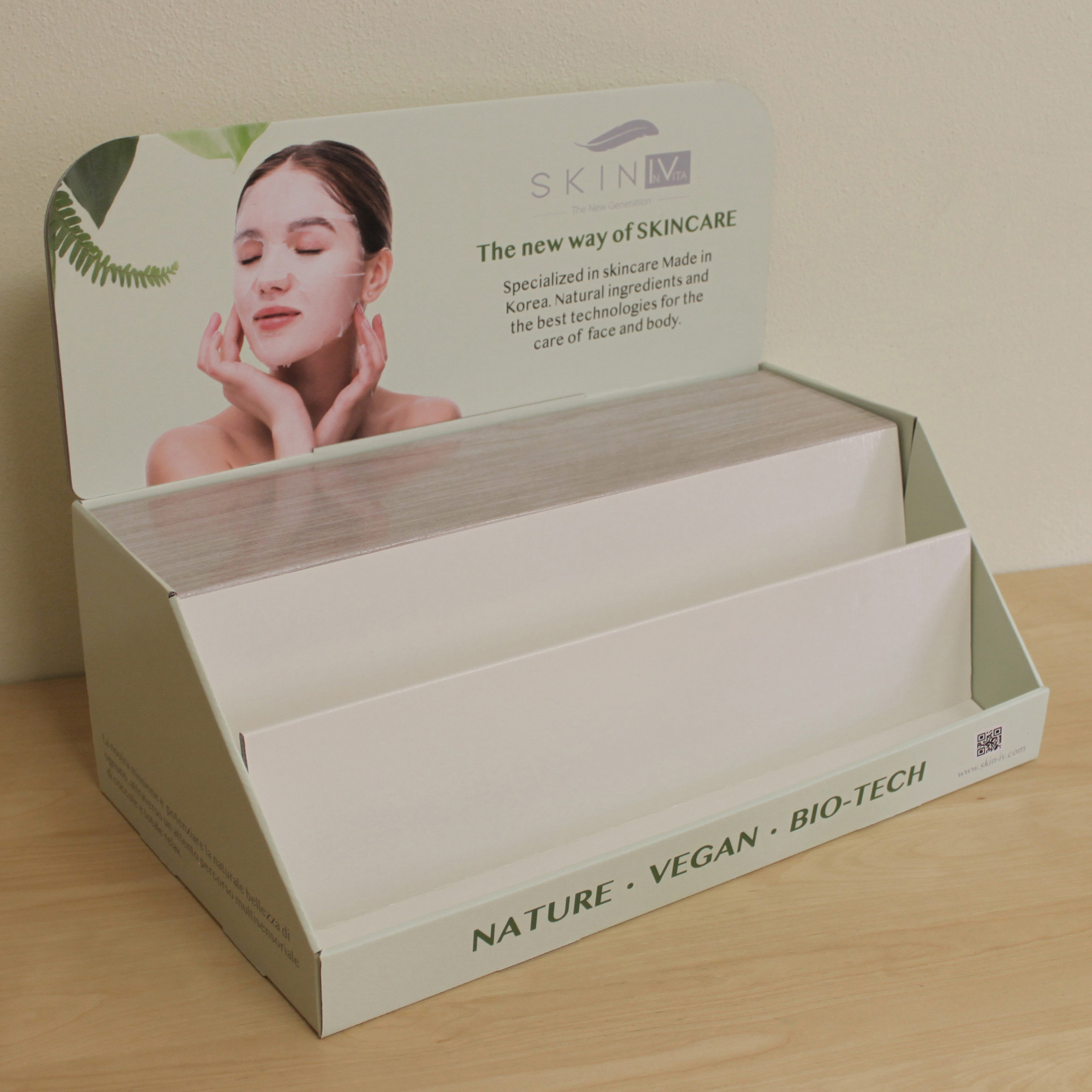 Espositore da banco realizzato in cartone microonda stampato e plastificato lucido.